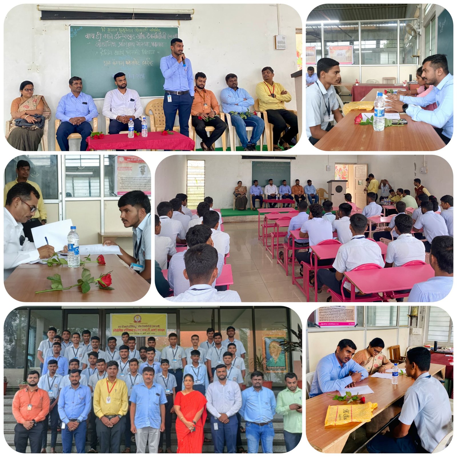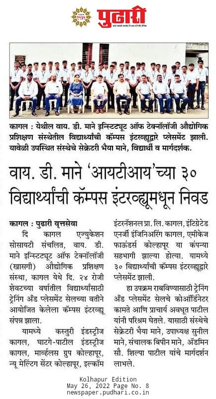 दि कागल एज्युकेशन सोसायटी संचलित वाय. डी. माने इन्स्टिट्यूट ऑफ टेक्नॉलॉजी (खाजगी) औद्योगिक प्रशिक्षण संस्था,कागल येथे दि 23 जुलै रोजी शेवटच्या वर्षातील विद्यार्थ्यांसाठी ट्रेनिंग अँड प्लेसमेंट सेलच्या वतीने आयोजित केलेला कॅम्पस इंटरव्यू संपन्न झाला.यामध्ये एमीकेज फाऊंडर्स, कागल सेफ स्टील मशीन प्रायव्हेट लिमिटेड कागल,शार्प इलेक्ट्रिकल,किर्लोस्कर ऑइल इंजिन कागल(T.P),शारदा इलेक्ट्रिकल,विद्युत इंजिनियर या कंपन्या सहभागी झाल्या होत्या. यामध्ये ५० पेक्षा अधिक विद्यार्थ्यांची विविध कंपन्यांमध्ये निवड झाली कॅम्पस इंटरव्यूद्वारे प्लेसमेंट झाली.हा उपक्रम राबवण्यासाठी ट्रेनिंग अँड प्लेसमेंट सेलचे कॉर्डिनेटर श्री अक्षय कामते यांनी विशेष परिश्रम घेतले. व प्राचार्य श्री अवधूत पाटील यांचे मार्गदर्शन लाभले.संस्थेचे सेक्रेटरी प्रताप उर्फ भैय्या माने,संस्थेचे विश्वस्त श्री बिपिन माने ,कॅम्पस संचालिका सौ शिल्पा पाटील सर्व उपस्थित होते